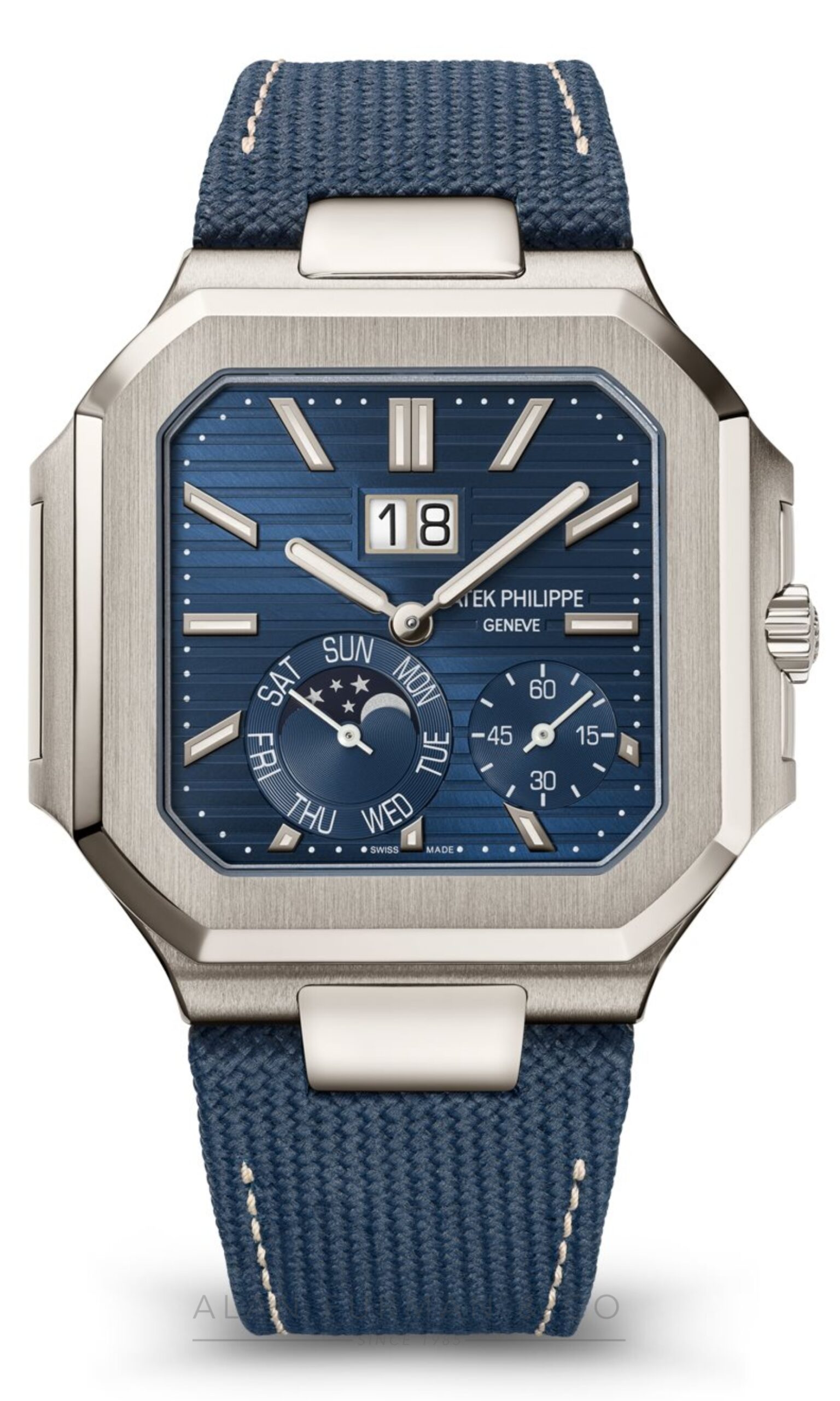 - Dial: Sunburst blue, horizontally embossed, white gold applied baton-style hour markers with white luminescent coating.