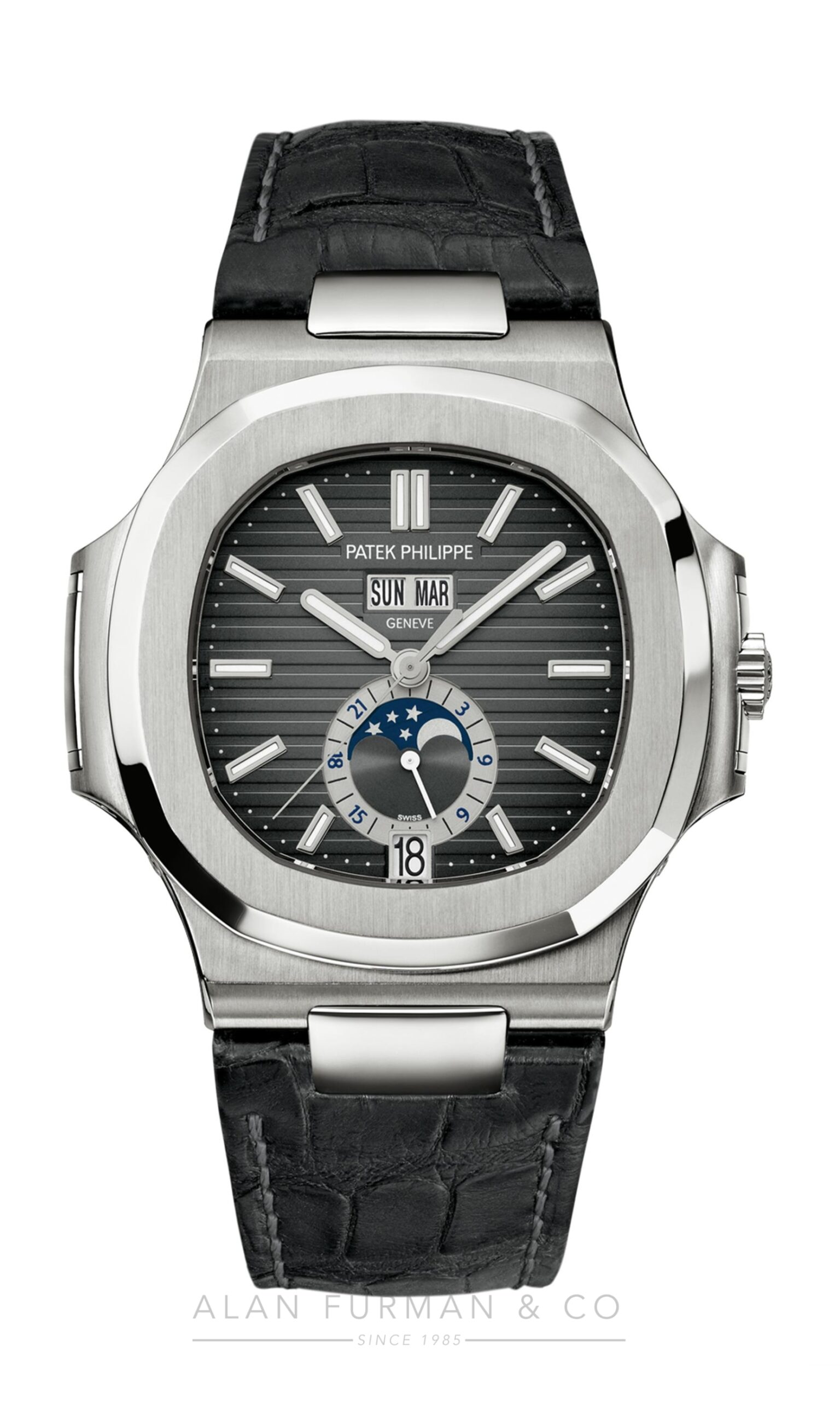 – Alligator strap with rectangular scales, hand-stitched, matt black